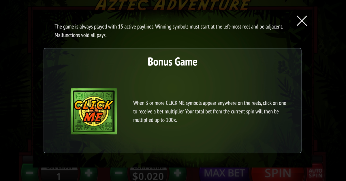 Slotland released this online slot machine is April 2013. When you begin to play Aztec Adventure, you will select the amount of money that you want to play. The betting begins at 0.002 and goes up to 0.02 per pay line. This range makes the maximum bet per pay line thirty cents. There is a multiplier in this game, which can amplify the fixed 500 coins jackpot. Aztec Adventure has a Max Bet and an auto-play feature that anyone can use.
