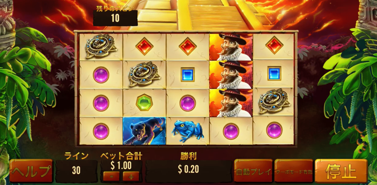 As we move to the paytable, we can see that there are 9 symbols in total. They are divided into two categories – highs and lows. The low-value symbols consist of four gems of different colors and shapes, while the high-value ones are frogs, snakes, compasses, panthers, and a lively conquistador, listed in increasing order of their value.