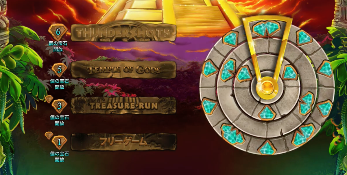 Collecting 1 gem will trigger the Free Spins bonus, while collecting 3 gems will trigger the Treasure Run bonus. Collect 5 gems to trigger the Temple of Gods bonus and collect 6 gems to trigger the Thundershots bonus.