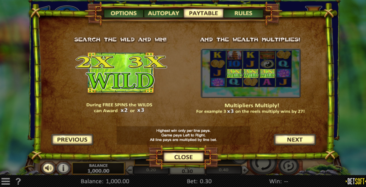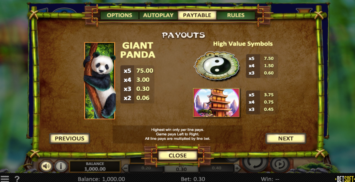 What’s more, 2x or 3x multipliers are awarded during free spins. The combined maximum winning value per payline is 27x. The maximum possible win is 53208x multiplied by your total bet. If Budha decides to grant you a lucky streak, this can be yours. Moreover, the wild symbols can appear on the second, third, or fourth reel. The free spin features can be triggered by finding the treasured Golden Panda scatter symbol.