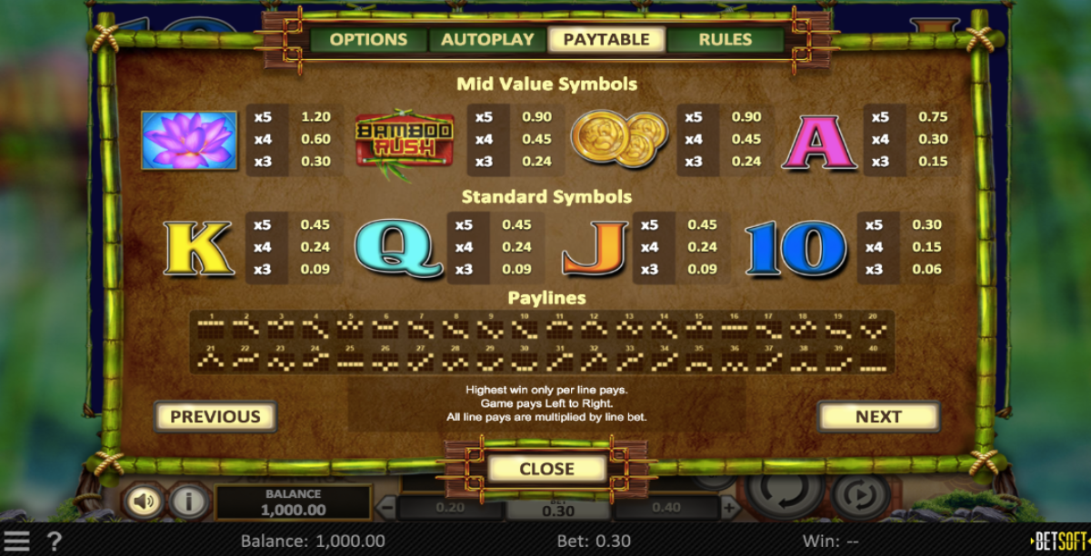 Furthermore, Bamboo Rush has interesting gameplay. The slot game has 5×4 reels available on 40 paylines. The game is played from left to right. There are 1024 ways to win. Players can use up to 20 coins to bet on Bamboo Rush per spin. The minimum stake is $0.20, while the maximum stake is $20. The game has an RTP of 96.90%, with strong prospects of boundless rewards.