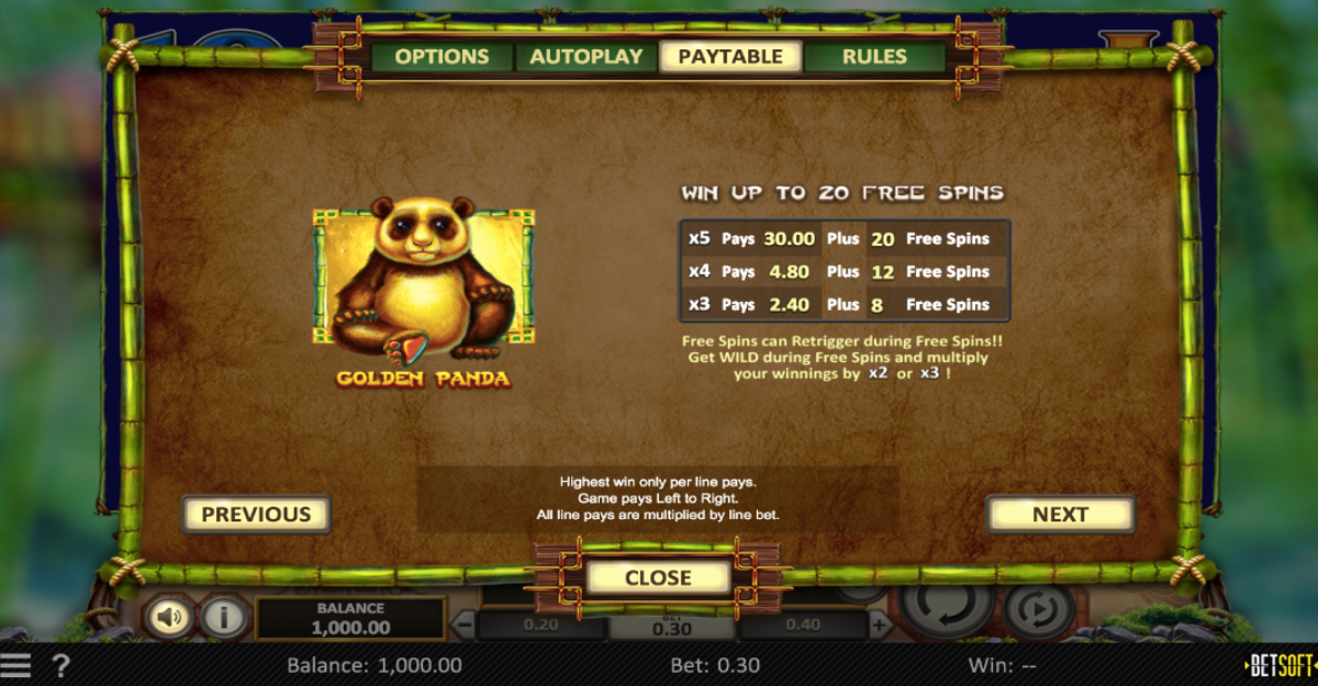 Landing the Wild symbol in the Golden Panda will multiply your winnings by 2s or 3s. Also, you can retrigger the extra spins.