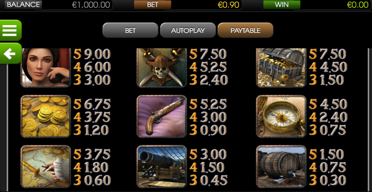 Familiarizing yourself with the characters before playing this slot game is highly recommended. Amongst others, you can find a damsel, coins, map, skull and treasure chest as well as a cannon musket and barrel full of gunpowder featured in this slot.