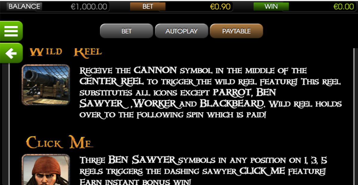 An added incentive is the Ben Sawyer symbol. When it appears on any of the reels, this triggers a click me feature and promptly rewards bonus credits!