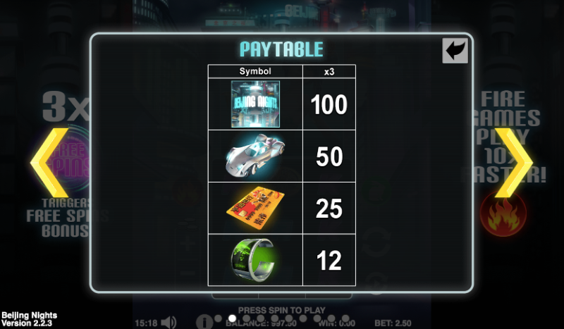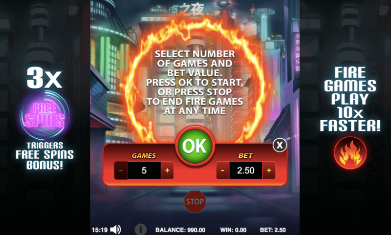 The game is set in Beijing’s future nightime, and has 5 lines that are always active. The lower set of reels (only containing higher-paying symbols) is used for the FREE SPINS bonus.This game includes FIRE GAMES, which adds a new layer of excitement to the game by allowing players to get right into it, with a ten x speed increase!