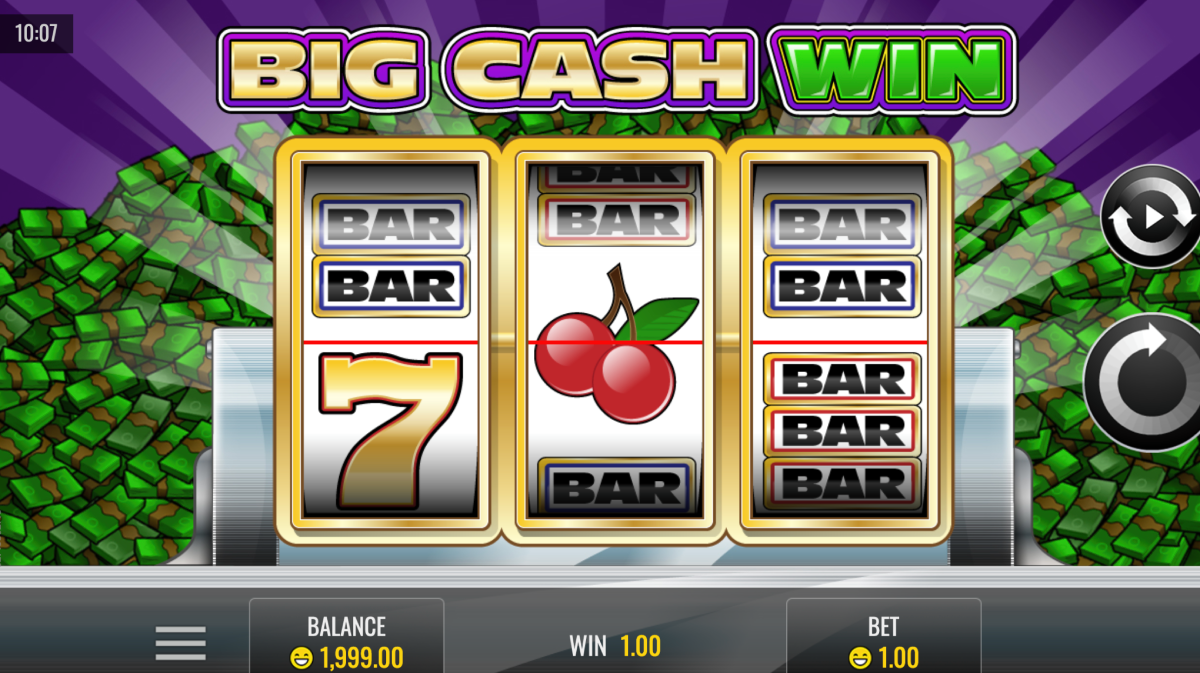 The Big Cash Win Logo is the highest paying symbol so keep your eyes peeled as your click on the “Spin” button and watch the fruits and bar icons on the reels.