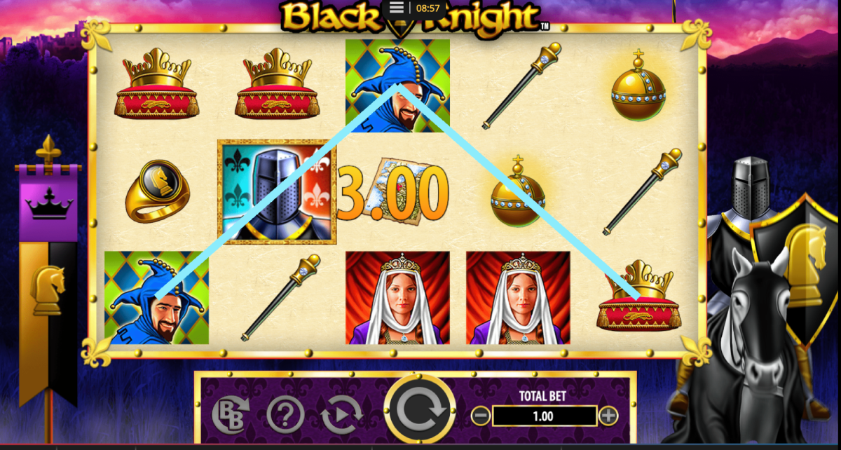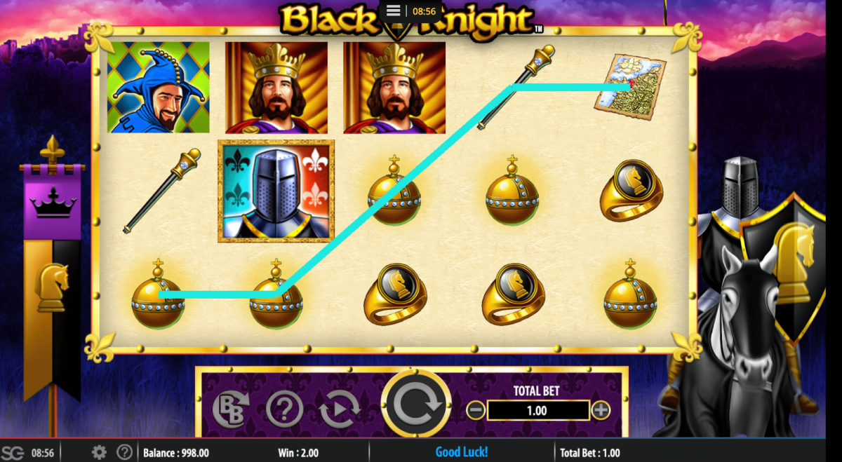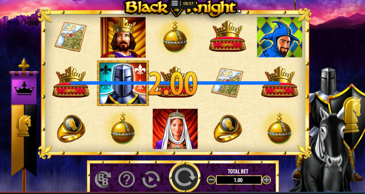 The slot machine has many different symbols, including the King, Queen, Crown, Maps, The Black Knight, Jesters, The Black Knight Logo, and the Black Knight Ring.
