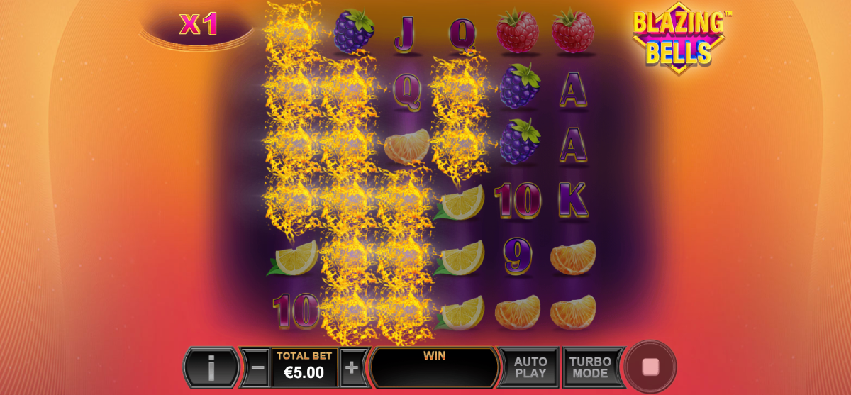 In the Blazing Bells PowerPlay Jackpot slot, the symbols in the base game may get a blaze added to them. When this happens, the activated symbols will expand to cover four nearby positions which can increase your chances of creating or improving a win.