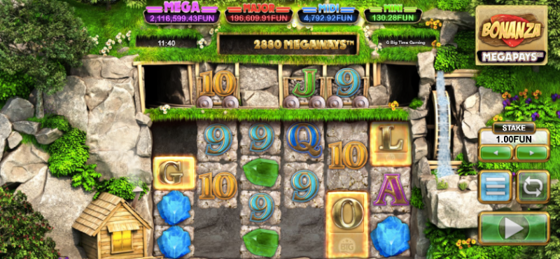At first glance, it’s evident that not much has changed in the appearance. The graphics have slightly improved with higher definition, showcasing more intricate details in rocks, clearer grass, and vibrant flowers. The only notable difference is the replacement of the waterfall in the logo with a prominent “MEGAPAYS” notice, ensuring players are aware of the version they’re enjoying. Additionally, there are now four jackpots displayed at the top of the screen, enticing players with the exciting prizes available. However, apart from these alterations, it remains the familiar Bonanza, accompanied by the captivating banjo twang when the reels are set in motion.