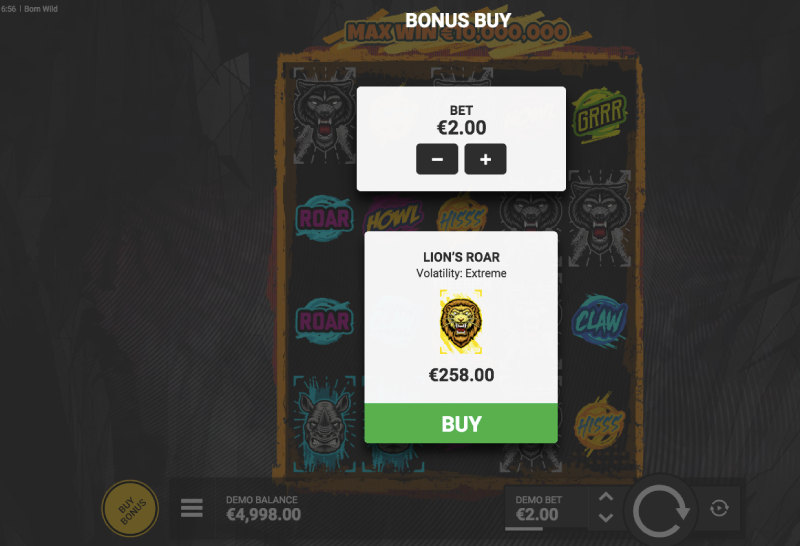 This 95% variance slot machine has a less than average theoretical payout of 93.8%. Bet 0.20 up to 100.00 on this game with a bonus buy that will award the Lion’s Roar feature following any spin while at 129x your wager.