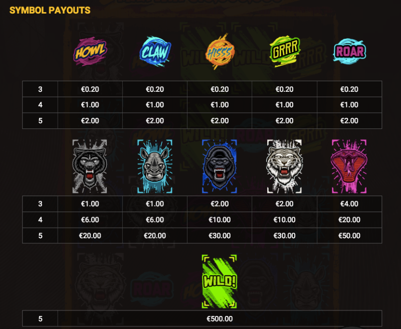This is a game of mixed symbols, where low cards are animal noises and high cards are dangerous animals. Landing five “Wild” symbols in a line trigger payouts worth 10 to 25 times the stake. Wilds are highly sought out symbols, not only because they replace any play symbol to complete a WIN line; they also pay out 250 times the bet when a line of five hits.