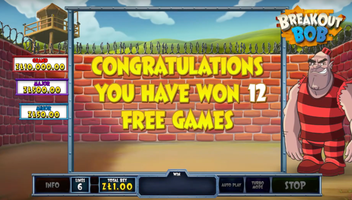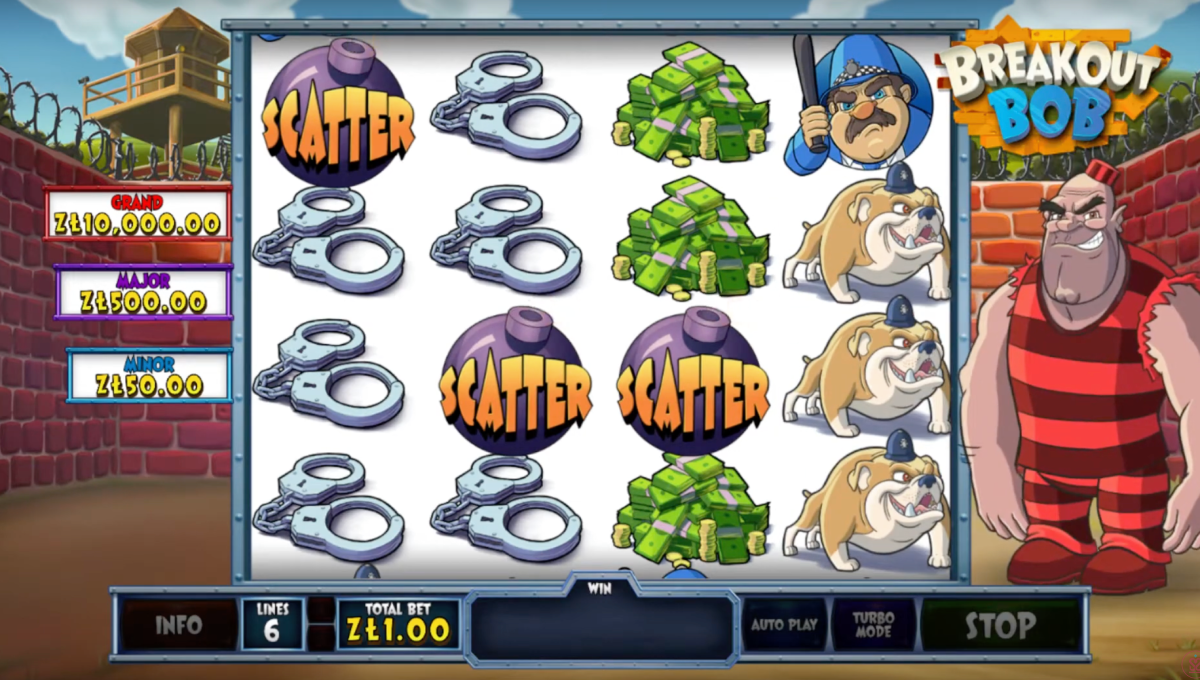 The Breakout Bob slot features a cartoon-style design that suits its prison yard setting. The background portrays brick walls, barbed wire, and a watchtower, with an animated character named Bob overseeing everything.