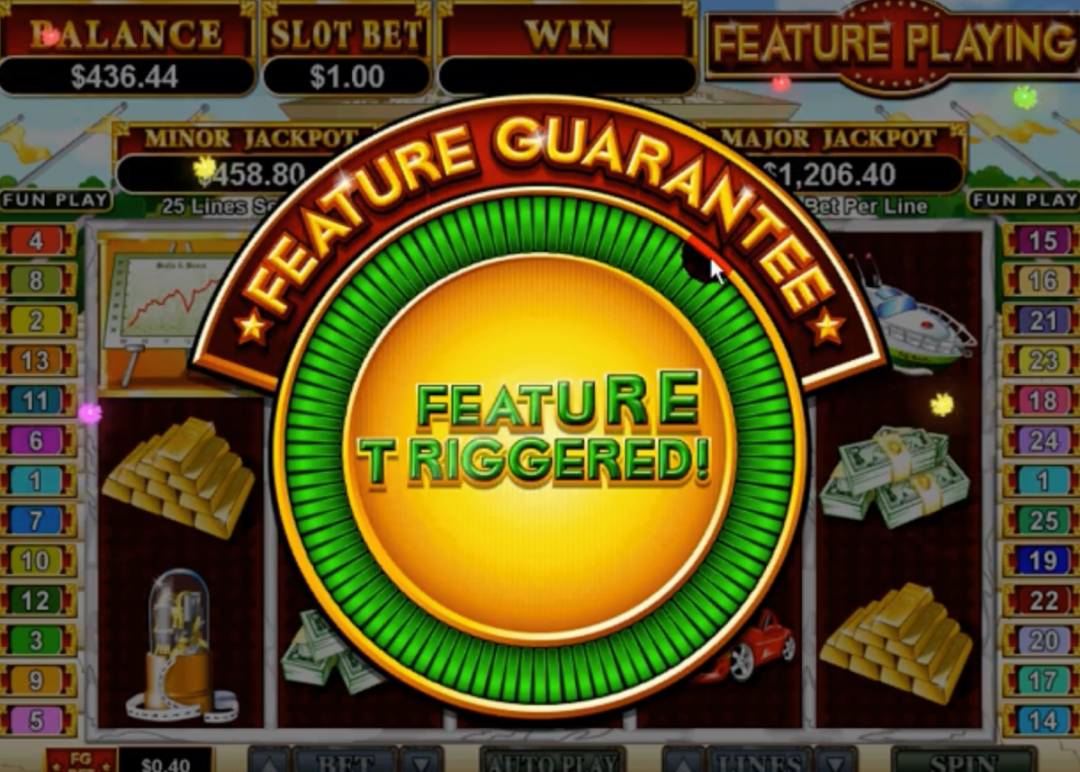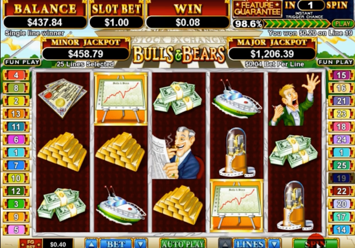 Bulls and Bears Slots is a stock market / Wall Street themed progressive video slot machine powered by Real Time Gaming (RTG) software. It features five reels, twenty-five pay lines, a multiplier, scatter wins, a wild symbol, free spins, a feature guaranteed a bonus round a fifty-six winning combinations plus a 10,000 coin jackpot.