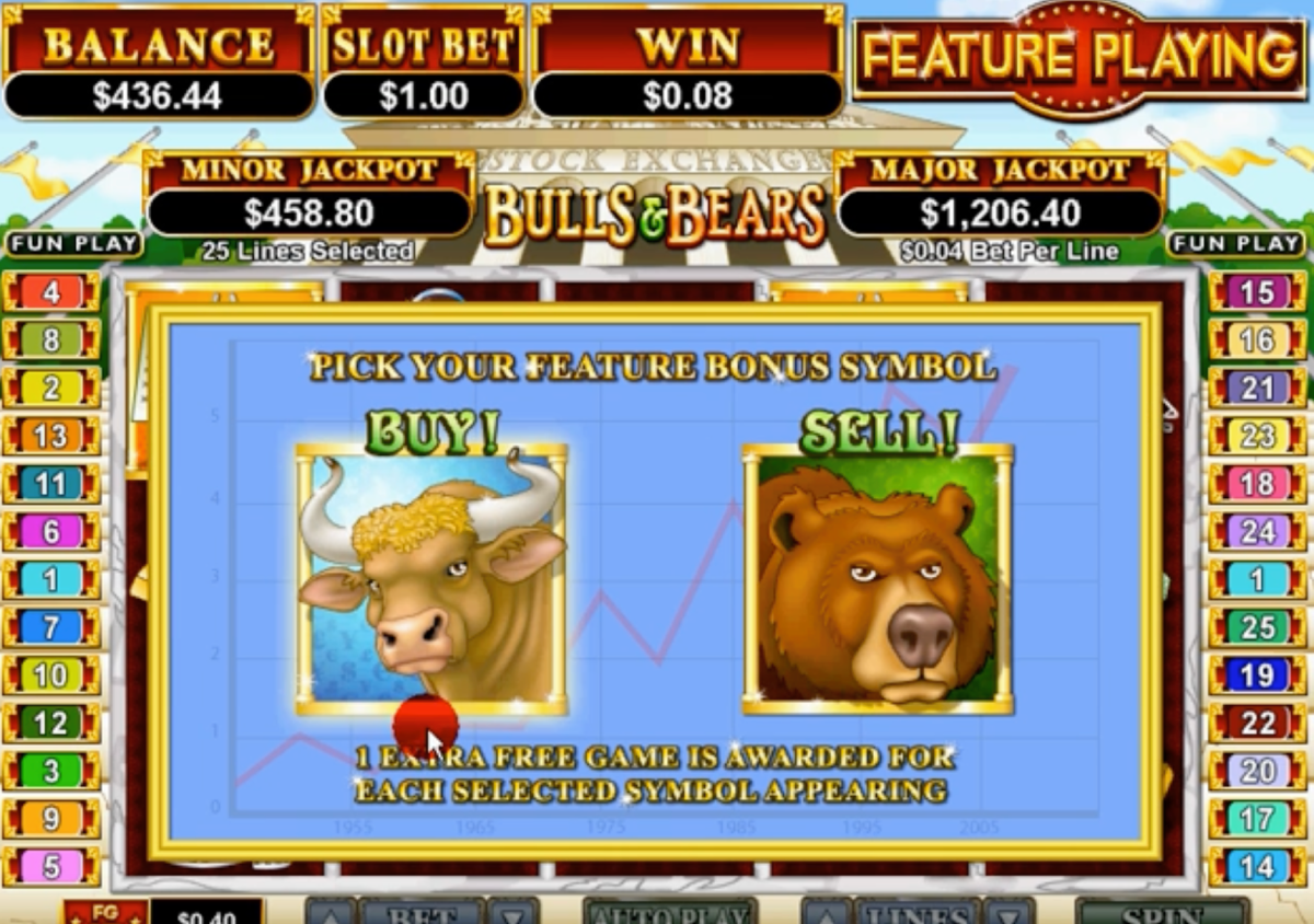 Before you start to spin the reels playing Bulls and Bears you have to select the amount you want to wager. You can bet as little as a penny or wager as much as one hundred twenty-five dollars per spin. You also can choose several different betting amounts as this game has a lot of wagering options.