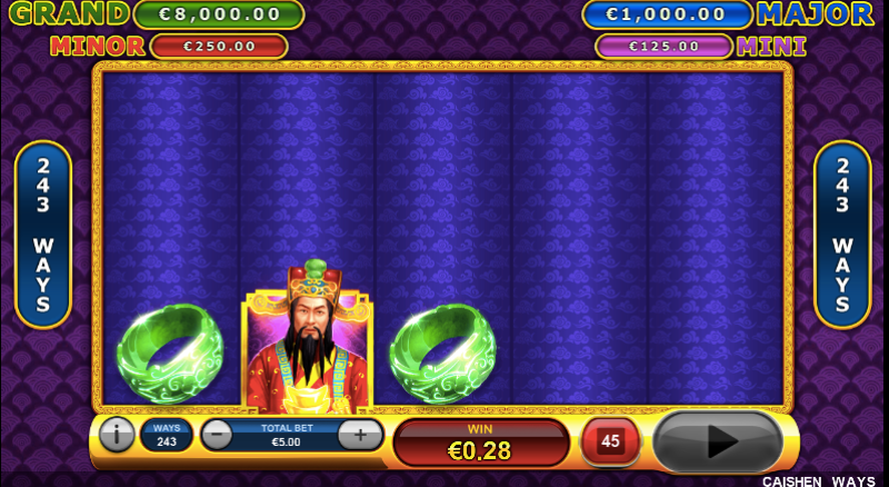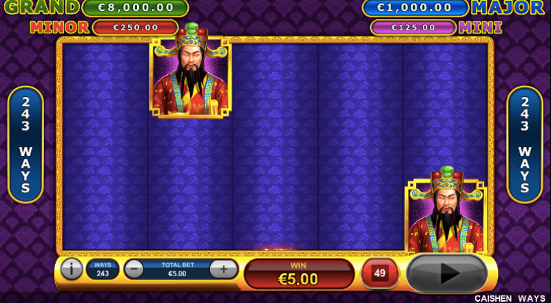 The Asian themed game begins with a Chinese music intro and takes you to the main screen. You will see an image of Caishen sitting above the reels, with boxes showing the game’s Grand, Major, Minor, and Mini jackpots. The game screen and reels are straightforward.