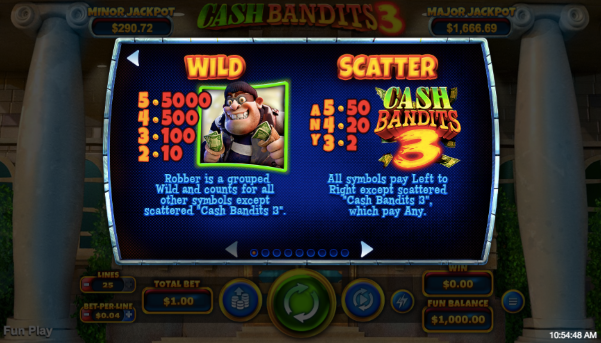 As with any online slot machine, you score wins by landing three or more of the same symbol. If you like the wild west themed symbols from the first and second versions, you should like these symbols. As you spin the reels, you will see a crazy cash bandit running across the wheels.