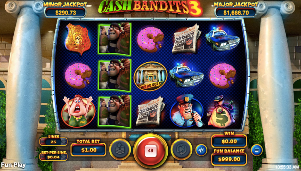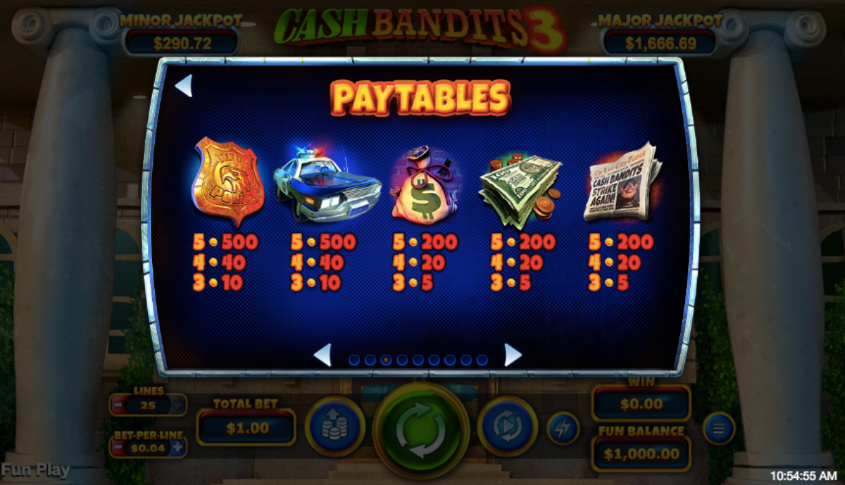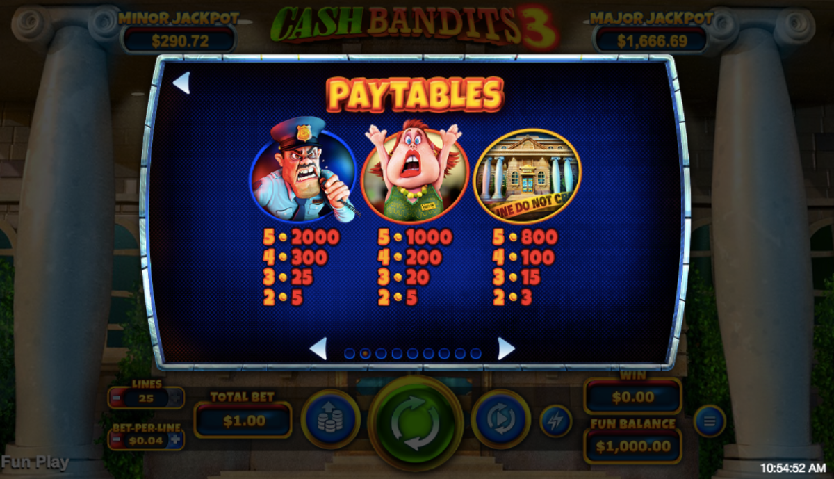 We love the graphics and all of Cash Bandits. Furthermore, there are some great multipliers. Moreover, these multipliers can provide such nice sized wins. The Cash Bandits 3 slot machine has five reels and twenty-five pay lines. Unlike the first and second version, this version has much more extraordinary innovative streaks. For starters, there is a 115,000x jackpot, which equals over two million dollars.