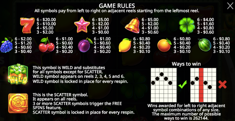 Click on the paytable to see a line-up of classic slot symbols, such as watermelons, oranges, plums, cherries, grapes, four-leaf clovers, bells, stars and sevens. A 6 of a kind combination formed from the four non-fruit symbols is worth a payout of 2 to 10 times the stake. The scatter, wild, and bank vault door scatter are the three symbols. The wild replaces any symbol bar the scatter on reels 2-6. During respins, wilds stay locked to the reels.
