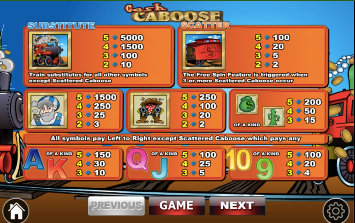 The cash caboose scatters icon appears on the second, third, fourth and the fifth pay lines. When up to 100 times your triggering bet when you land a cash caboose scatter plus free spins.