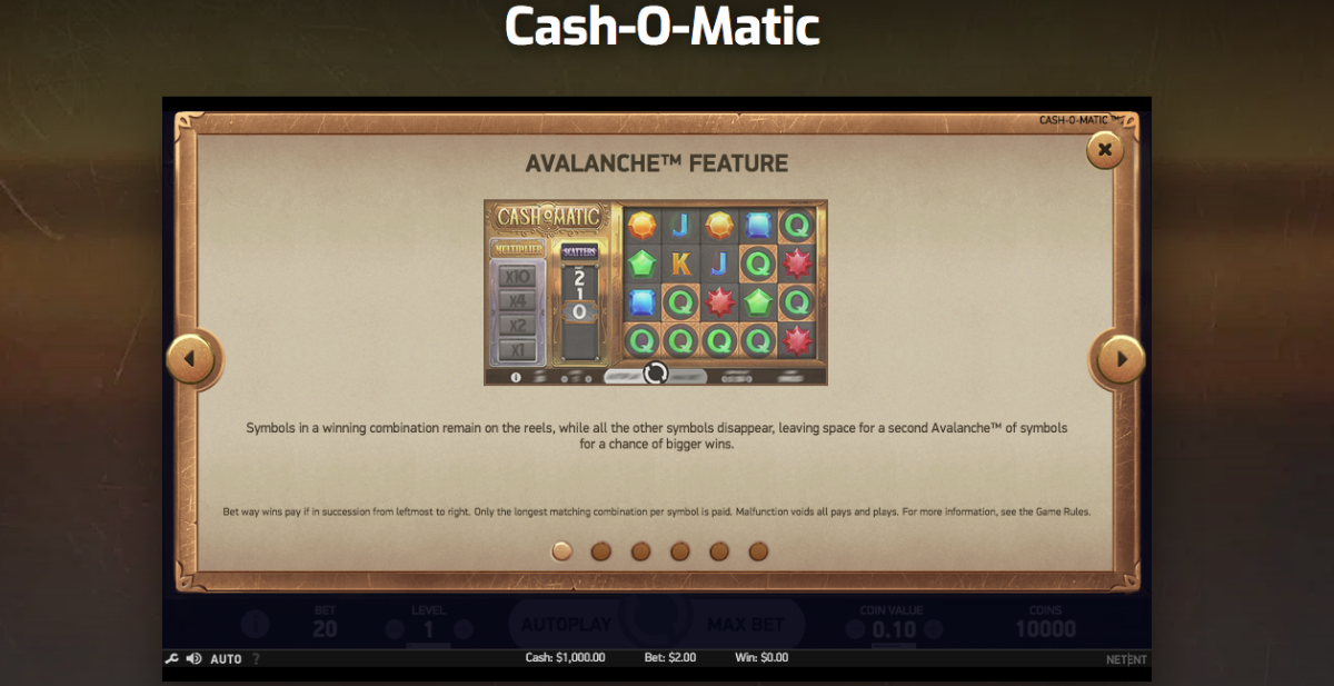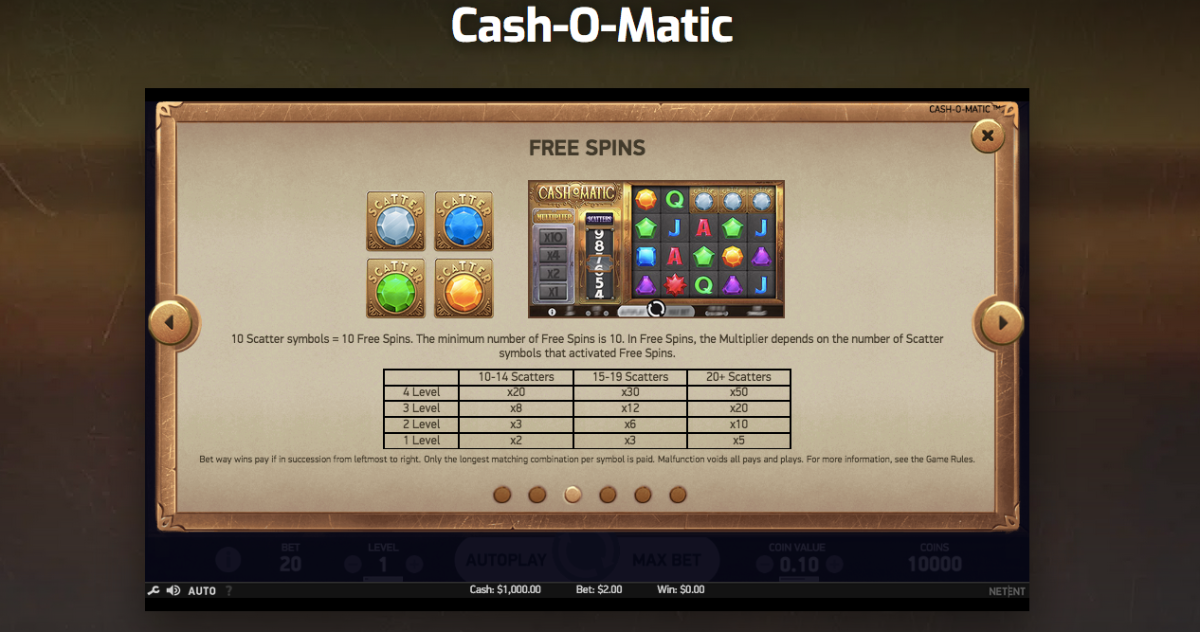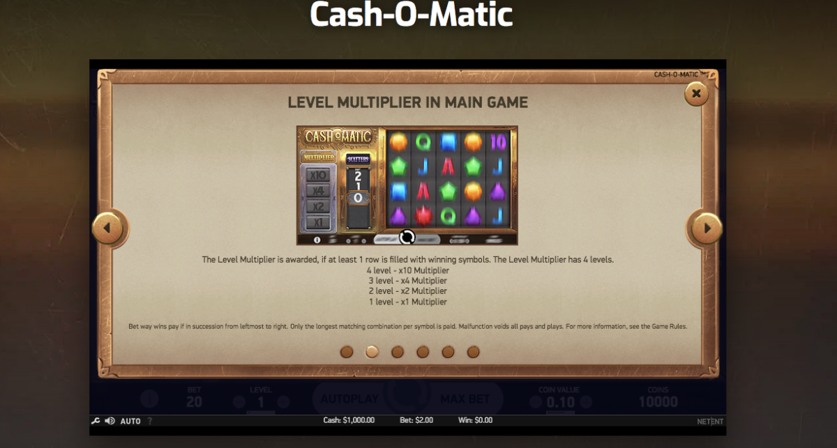 Cash-O-Matic has many unique features besides 1024 ways to win. Ultimately, this title is filled with multipliers, free spins, cascading reel betting action, and a level multiplier feature.