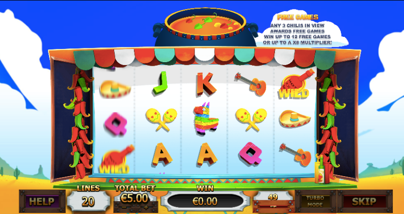 The setting of this slot game is in a desert filled with cacti under a blue sky, with the reels situated under a colorful awning. The area is decorated with chili strings, and there is a pot balanced on top of the reels. The game has a Mexican theme.