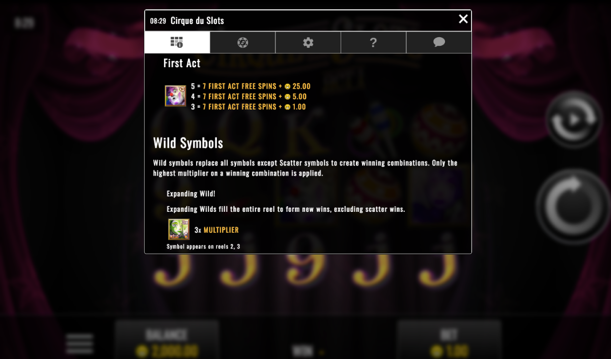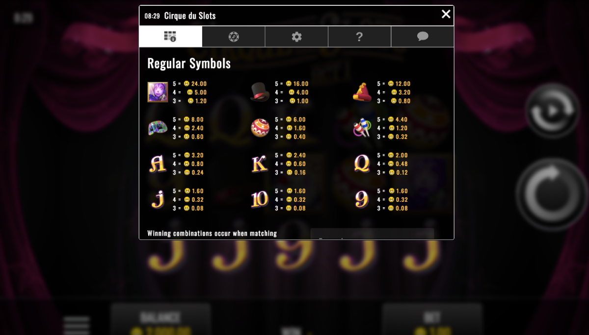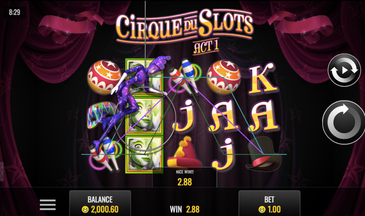 The Cirque Du slots game features five reels and has 25 pay lines. Rival software providers power this video slot machine game. Play the game on the Internet in your browser, on Apple iPhones, Android phones, Samsung Galaxy phones, Apple iPads and most tablets and mobile Smartphones.