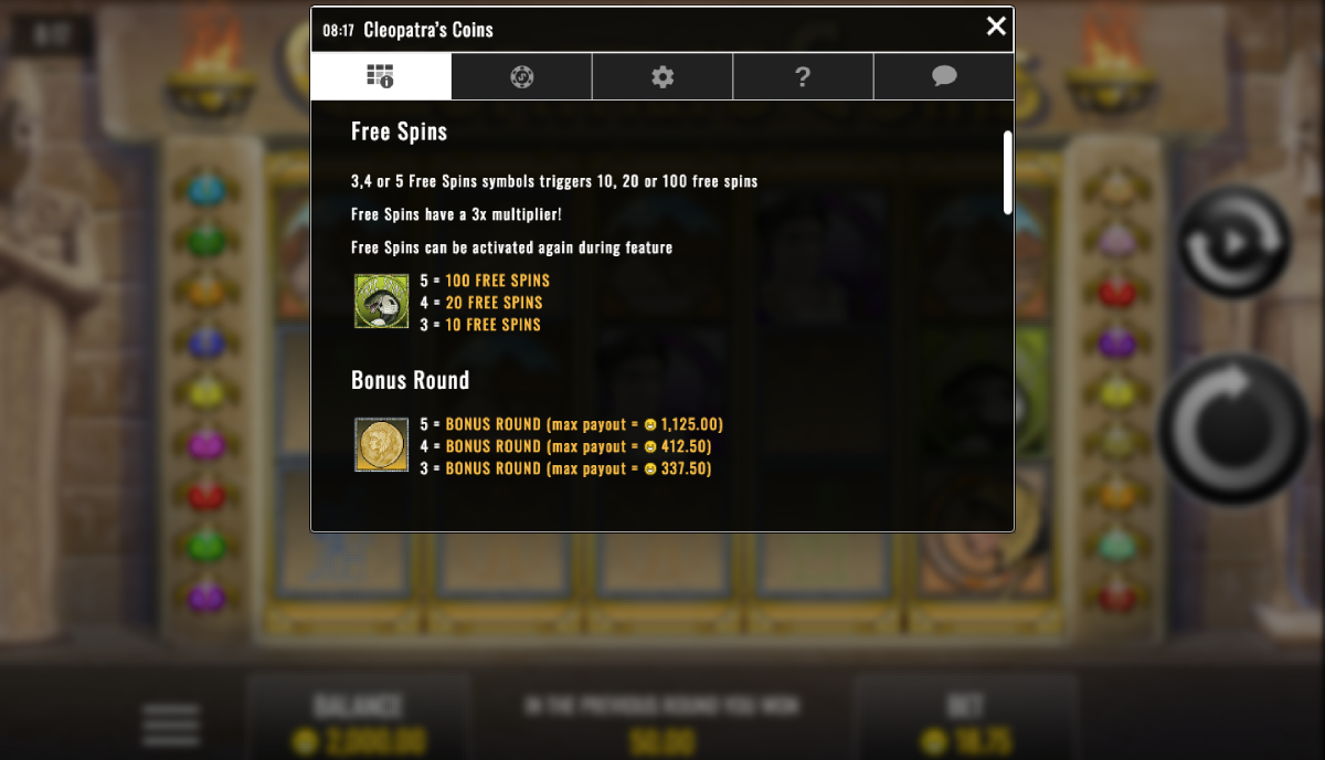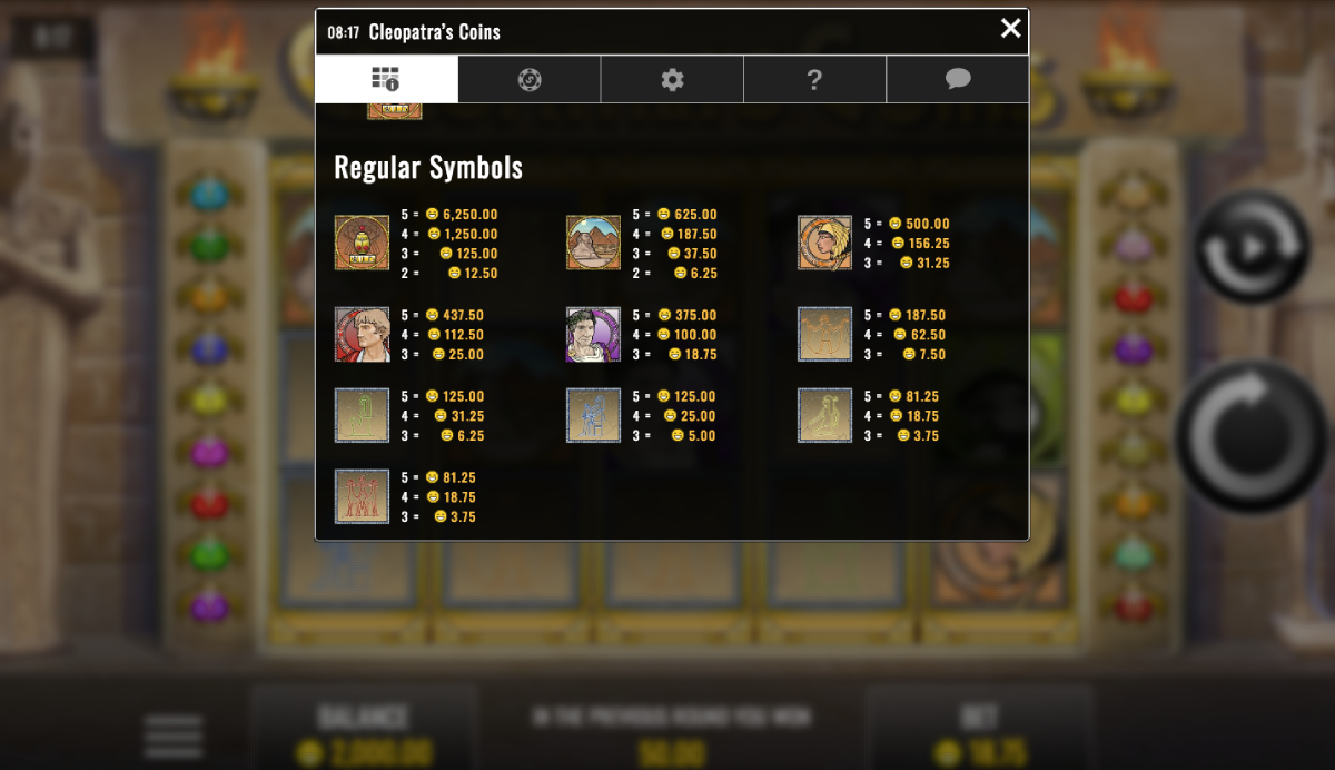 The game has a pretty nice betting range. It is ideal for penny slot players as you start playing Cleopatra’s Coins for only one penny per spin.