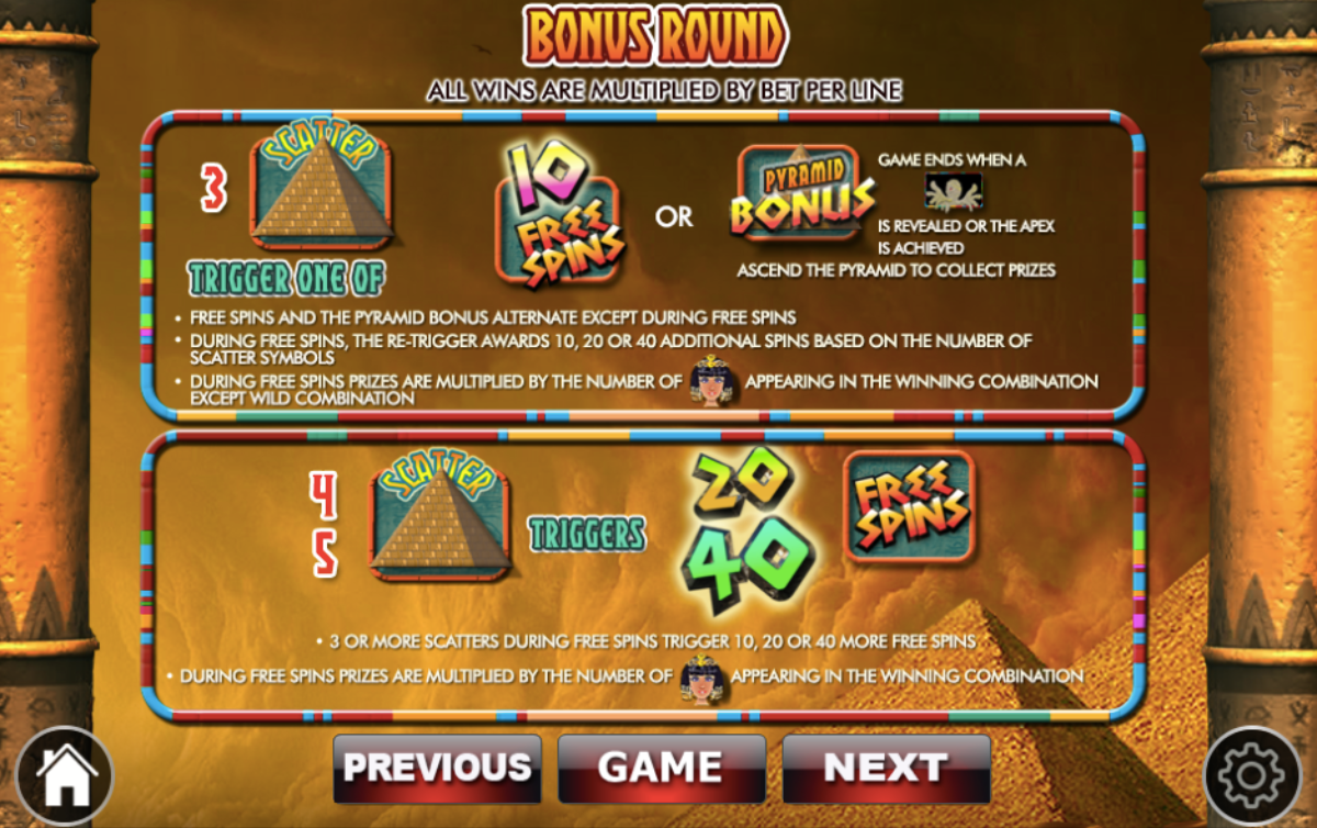 Score 3 blue beetle scatters on the wheels and triggers the free spins bonus game. The bonus round consists of 15 free spins. Score the pyramid bonus icon on the second and the fourth reel, and you will trigger another bonus round.