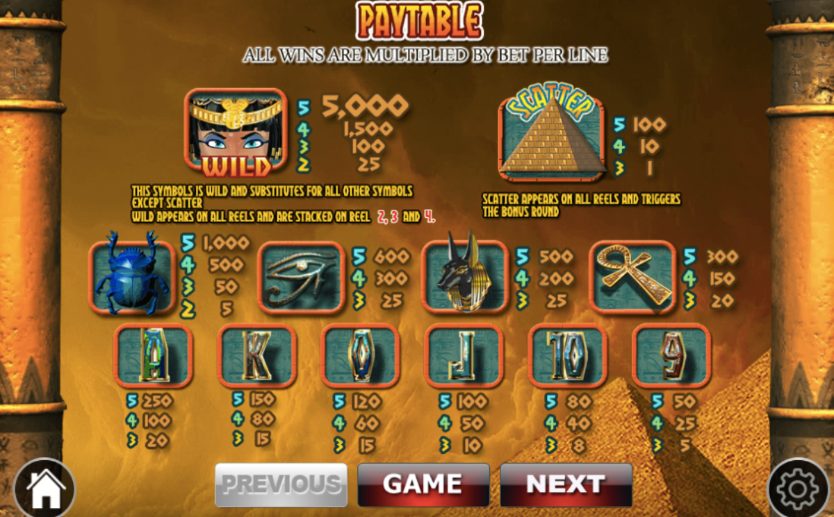 Enjoy watching the eagles, blue beetles, sarcophagus, blue eye, pyramids. Sphinx, gold eye, and Cleopatra. You will see poker playing cards symbols from the nine to the Ace.