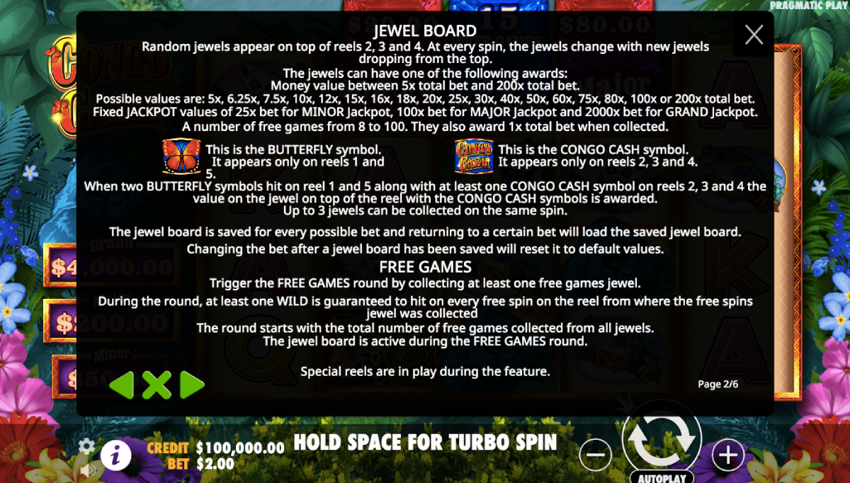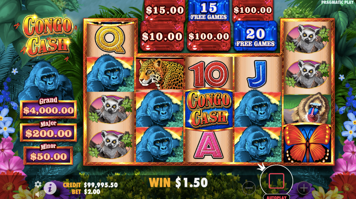 To win one of these enticing prizes, you need a bit of luck! Just land two Butterfly symbols on reels one and five, plus the Congo Cash symbol on reels 2 to 4.After spinning the wheel, you may be rewarded with one to three of the prizes above Congo Cash symbol. Â