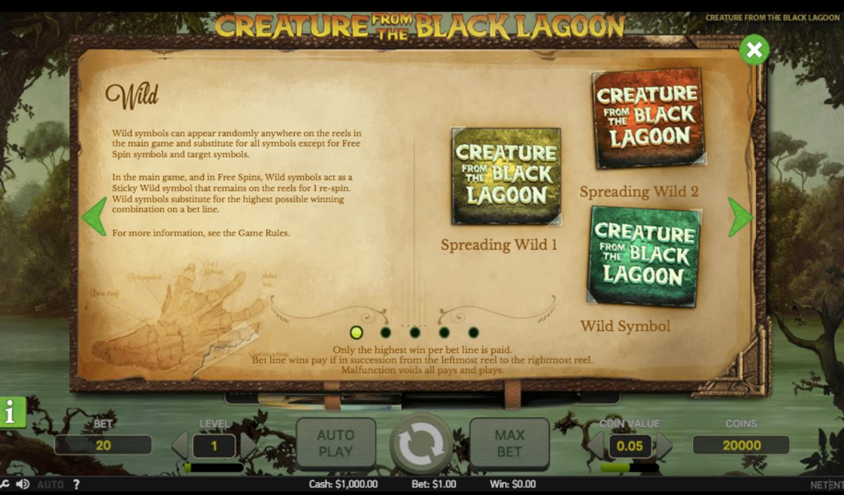 The Creature From The Black Lagoon slot machine features five reels, twenty pay lines, free spins, sticky wild symbols, respins and spreading wilds.
