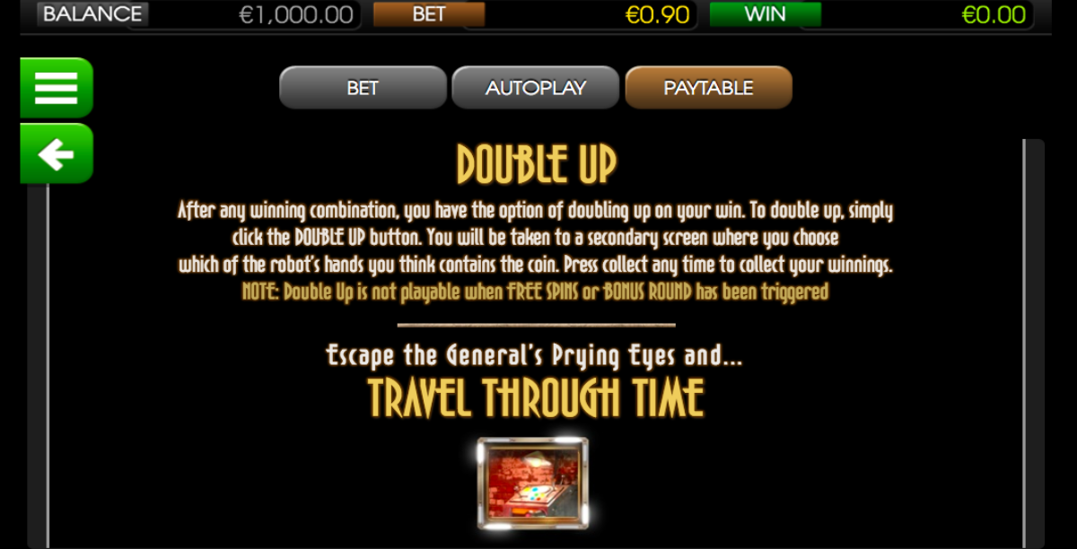 This free slots game has 5 reels and 30 paylines, offering numerous opportunities to win big. It also features exciting bonus elements like Scatters and Wilds. The symbols on the reels are all thematically related, showcasing the curious machine, controls, a futuristic city, a formidable general, machine design, an autobot assistant, a clock, and the eccentric inventor Miles Bellhouse.