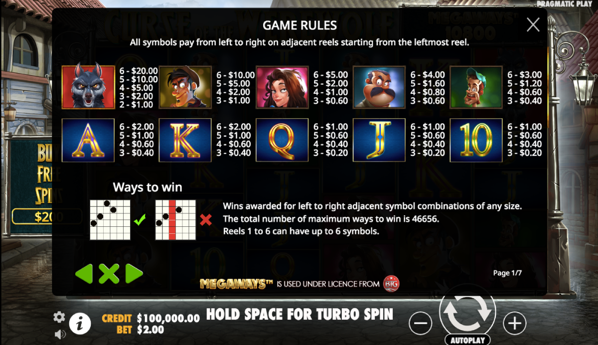Before you start to play the Curse of the Werewolf Megaways, you need to choose how much money you want to bet. You could start wagering anywhere from $.10 up to $100 per spin. Now that we went over the betting limits, let’s move onto the pay table. If you score a 10 a jack or king you will win five times your bed. If you match 310 Jager Queens you will win three times your bet.
