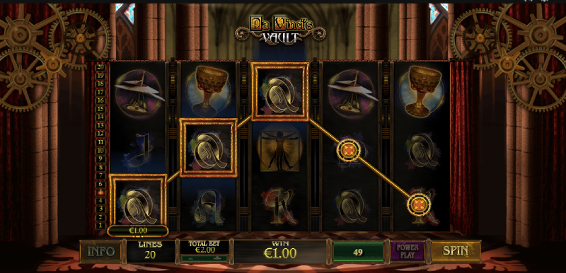 The game called “Da Vinci’s Vault” is a slot machine created by Playtech. It has 5 reels and 20 paylines, and can be played on any device from 20p per spin. The game is inspired by Leonardo Da Vinci and features duplicate symbols for larger payouts. It also includes a Free Spins feature that offers unlimited free spins and two additional wild symbols.