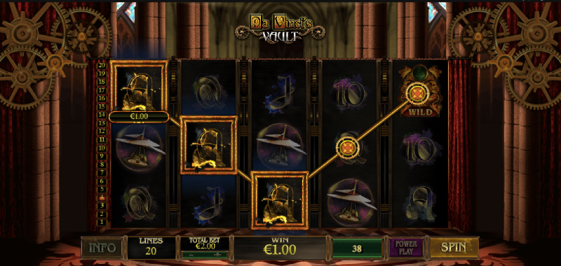 Da Vinci’s Vault offers great visuals that take you into the vault of the original Renaissance man. In the background, there are turning cogs, and the symbols on the reels include playing cards A, K, Q, J, and 10, as well as goblets, paintings of Vitruvian Man, flying machines/helicopters, and the Mona Lisa.