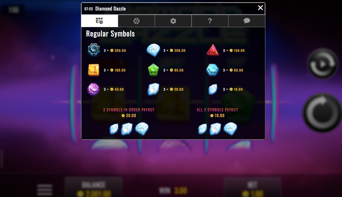 The goal to win money instantly is to line up any three of the same symbol on the reel at the same time. You can view the pay table on the right-hand side of the slot machine to see the value for each of the Diamonds. The highest paying symbols are when you land three of the gems on the reels in a row, as they are certainly the rarest of all of the Diamonds.