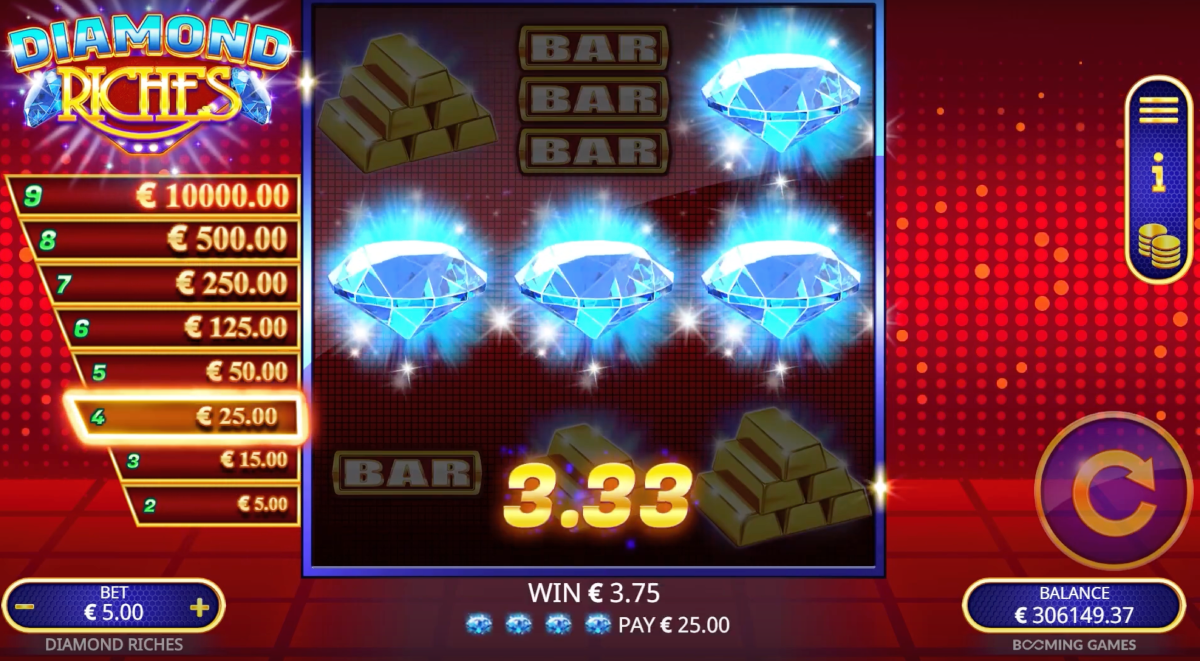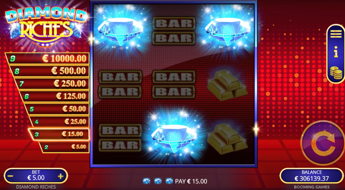 Diamond Riches is a slot game by Booming Games that can be played on desktop and mobile. It has 3 reels, 10 lines, and offers unlimited free spins. The game features symbols like single, double, and triple BAR emblems, gold bars, and diamonds. If you get enough diamonds in a spin, you can win up to 2,000 times your total bet, which is a maximum of 100,000.00. You can also gamble your base game winnings up to a fixed maximum payout of 10,000.00.