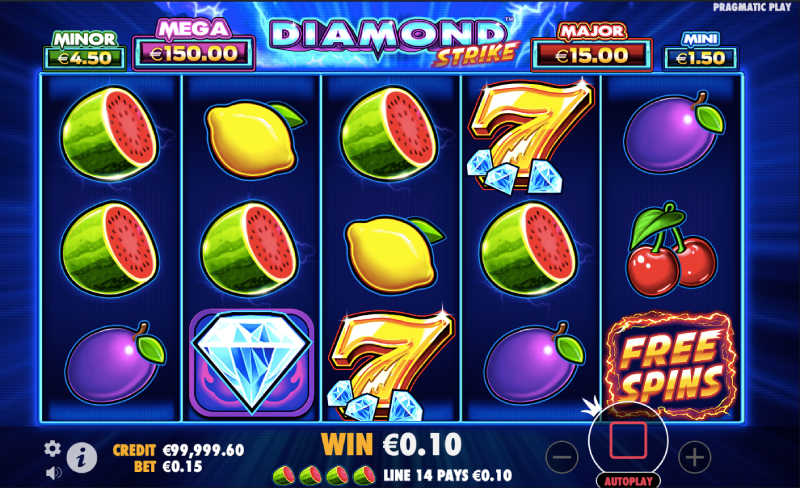 The goal is to line up 3 identical diamonds, with the trio reflecting a mini, minor, major, or mega jackpot amount that multiplies your original bet.