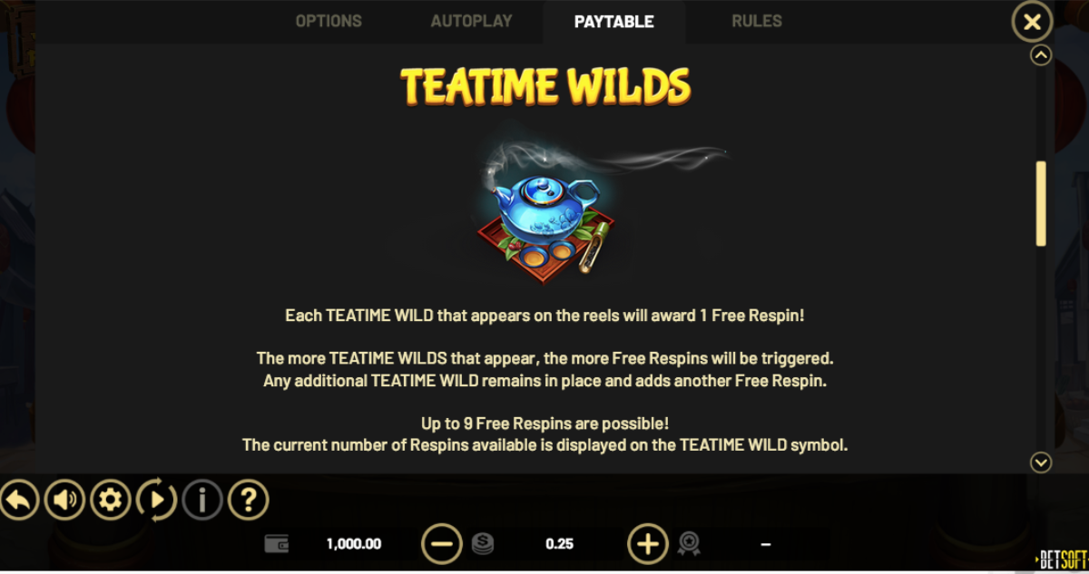 The bamboo basket bonus symbol can randomly appear on reels 2, 3, and 4. When the baskets are opened, they will either reveal a crimson scatter or a teapot wild.