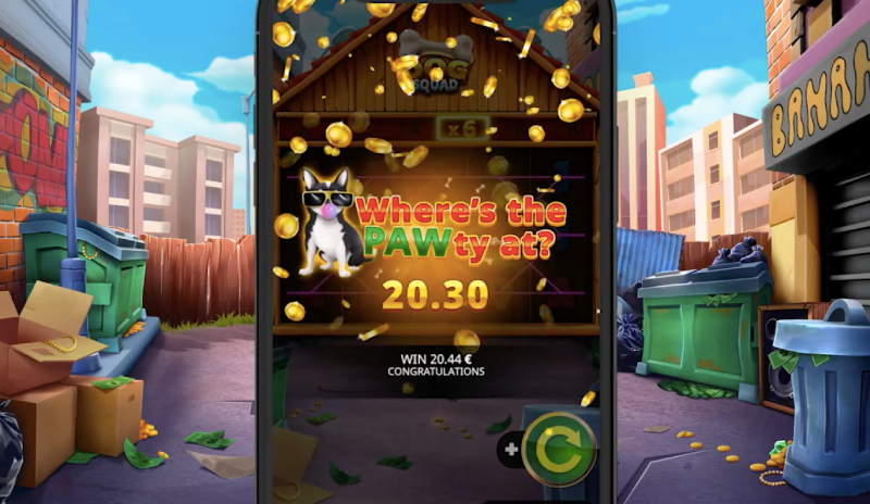 The Dog Squad bonus mode can be activated by any spin in the base game. Once triggered, a multiplier value will be randomly assigned from the options of 2x, 4x, 6x, 8x, or 10x which are displayed above the game screen. This multiplier will be applied to all prizes won during the round.
