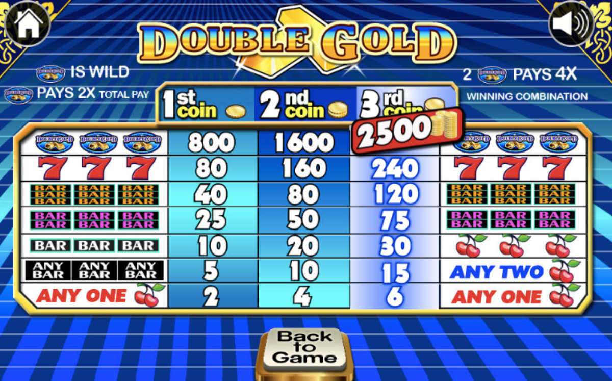 Win the 2500 fixed coin jackpot when you score three “double gold” wild logos betting three coins. If you get three double golds but are betting one coin, you will win 800 coins.