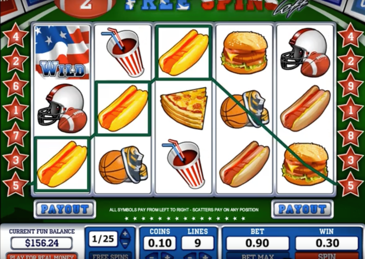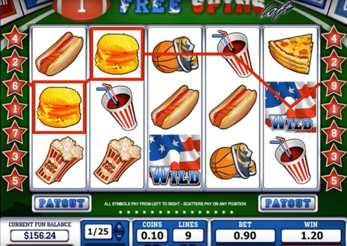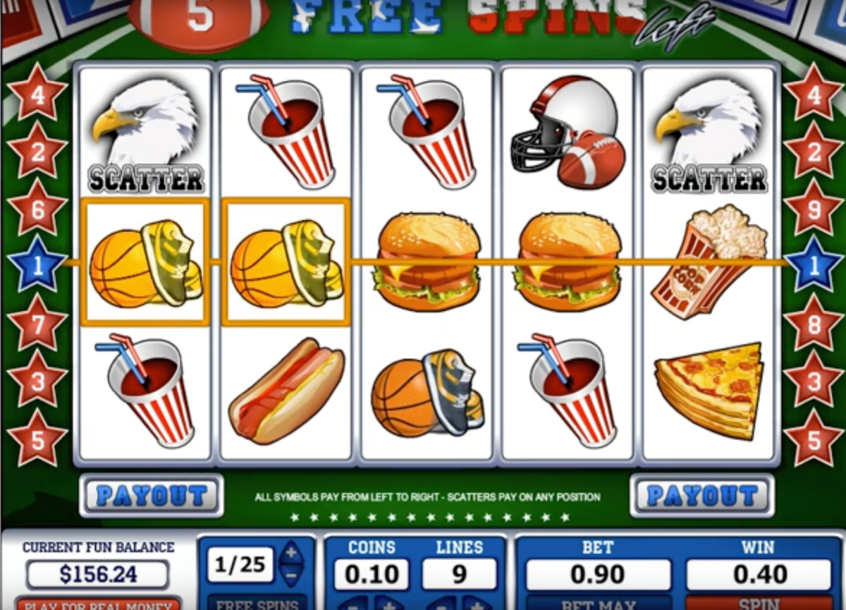 The symbols you will find on the Douguie’s Delights include Baseball, Football, Basketball, Hamburger, Old Glory (wild symbol),Pizza, Hot Dog, Popcorn Drink, Bald Eagle (scatter symbol), and Lady Liberty (bonus symbol).