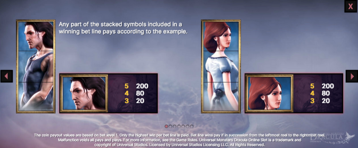 Store the Count symbol on the wheels, and he will replace all of the other icons except the bat scattered to help you put together a successful combination. Score 3 or more bats on the wheel and you will trigger the bonus round, which has the best wins in the game. Score the stacked lady on the second and the fourth wheels together and trigger the second free spins bonus round. Trigger the 200X multiplier by landing five beautiful women on the wheels.