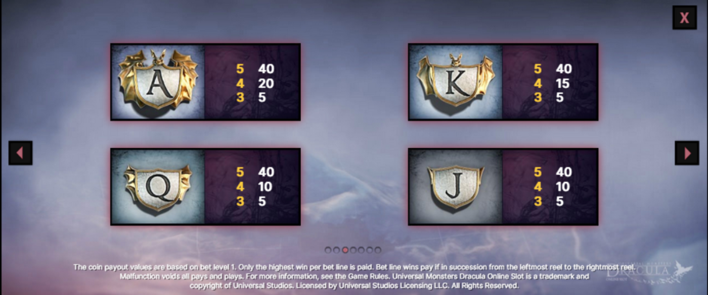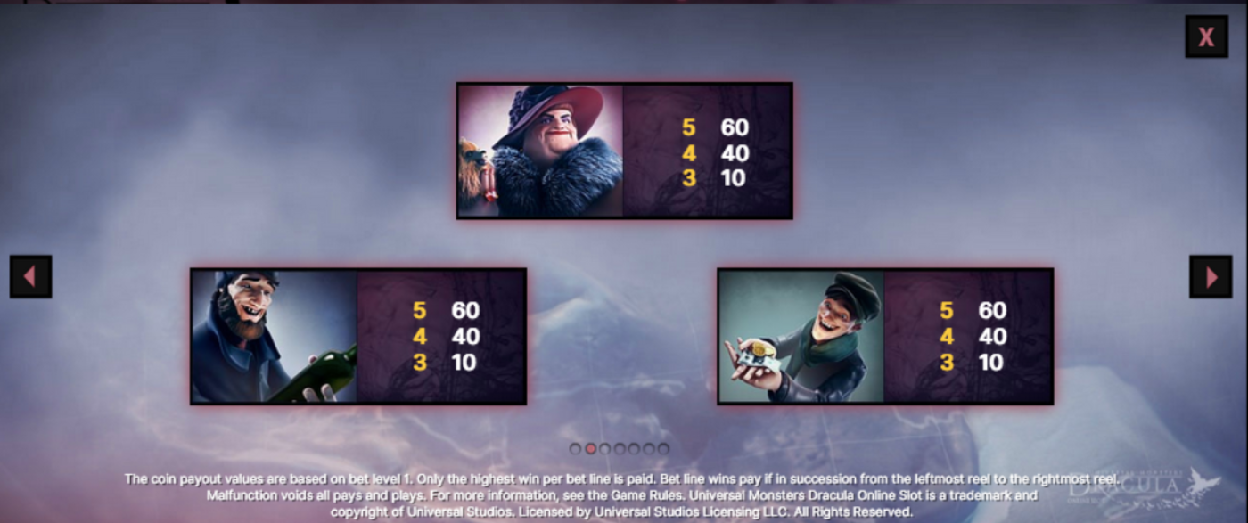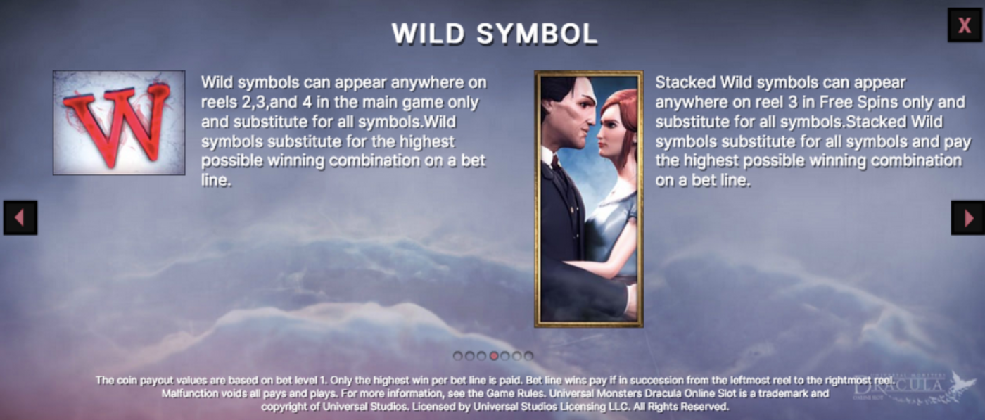 Enjoy the three-dimensional poker playing card symbols in addition to “Count Dracula” himself. In addition to ‘The Count,’ the symbols consist of a beggar, a man grasping a bottle of champagne, stacked Lady, bats, and an elderly woman.