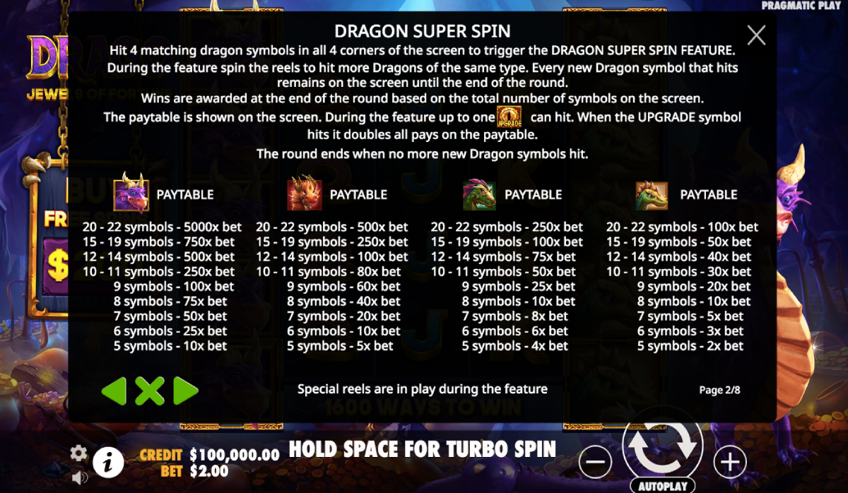This will continue as more of the same dragon appear. They will keep locking on the reels and award a cash prize according to how many you landed at the end of the rounds. While 20+ baby dragons will offer a maximum of 100x your bet, 20+ symbols of green, red, and purple dragons will offer 250x, 500x, and 5000x your bet, respectively.