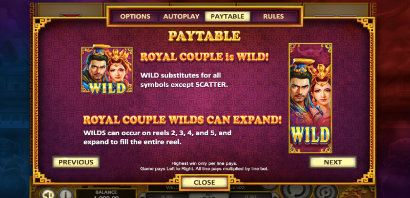 In the game Dragon & Phoenix, the Royal Couple symbol takes on a wild role, substituting for all symbols except the scatter. This wild icon can appear on the 2nd, 3rd, 4th, or 5th reel, expanding to cover the entire reel during gameplay.