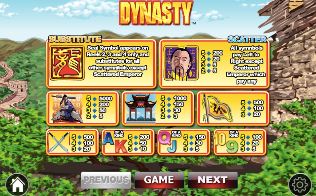 The symbol you will see on the wheels are all indicative of the Chinese culture and the Ming Dynasty. You will also see poker playing card symbols on the wheels like the Jack, the nine, the Queen, the 10, the Ace, and The King. Have fun watching the emperor, last two-reel symbols, imperial seal the warrior, the yellow flag, temple and the swords.