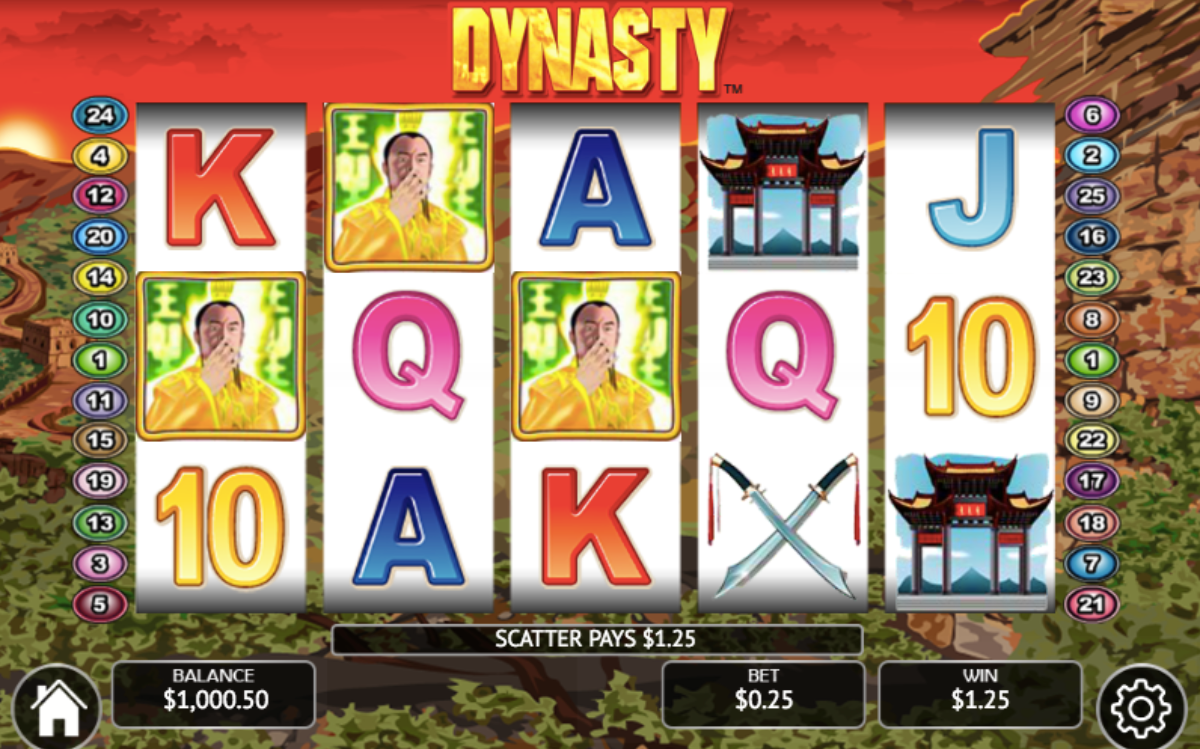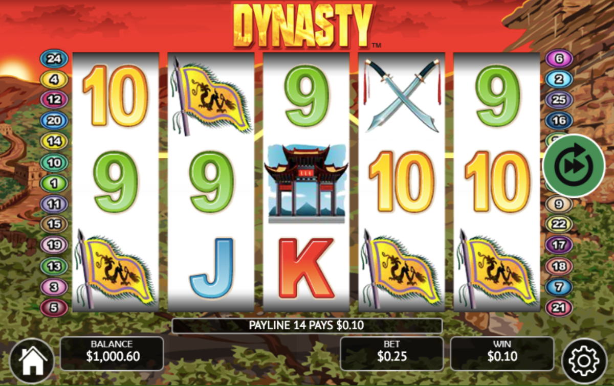 Dynasty has five reels with twenty-five pay lines. Wager Gaming Solutions (WGS) powers this video slot machine that you can play for high stakes or pennies. Microgaming has a game with the same name, don’t confuse them. There is no progressive jackpot.