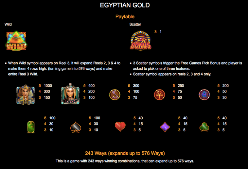 Egyptian Gold can have up to 576 paylines thanks to its mechanism.