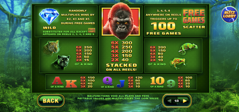Although the gorilla is not a wild animal, it is not completely domesticated either. It can appear on any of the six reels and can stack itself up both in the main game and in the free games feature. The boss symbol pays out the most, with 300 for 6 symbols, 250 for 5 symbols, 200 for 4 symbols, 150 for 3 symbols, and 40 for 2 symbols.